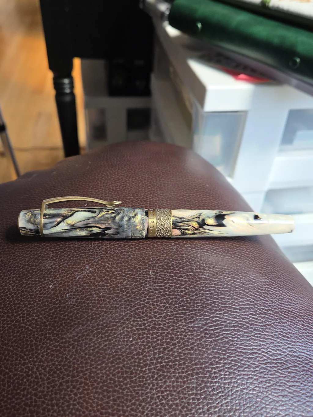 My Kilk Celestial in golden abalone arrived yesterday (sooner than I expected). It's simply gorgeous! The resin has lovely chatoyancy and depth. There's a hint of rose in the mix and subtle golden shimmer that's enhanced by the antique brass clip and trim. It looks so much better in person than it does in photos, because turning the pen reveals the shimmer and iridescence. This is a pen that's meant to be in motion. But it's not flashy; it's classy.