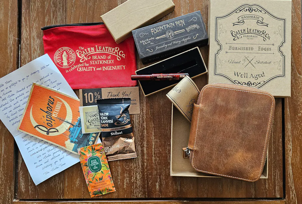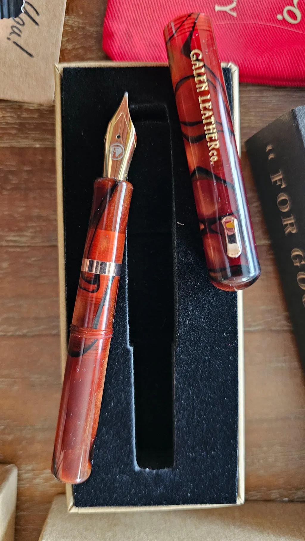 As always buying from Galen is a guarantee and this time they didn’t disappoint! Amazing super sheen ink with deep burnt red color and the most amazing green sheen. Lots of shades, very easy to use. ( I had been using it nonstop) Super fast shipping and Yunus took care of any customs issues. The “extras” are amazing and a beautiful homage to the Turkey culture! Thank you so much!