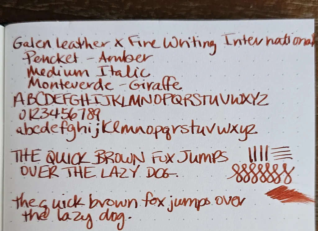 The color of this pen is a dark amber with a nice swirl to the resin and its chatoyance. It's a gorgeous pen and the medium italic nib writes beautifully. So smooth!