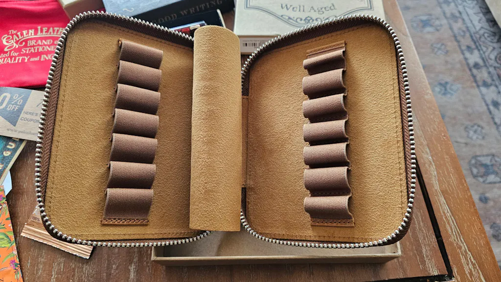 This crazy horse brown leather zippered pen case has a velvet lined interior and holds up to 14 pocket size pens.