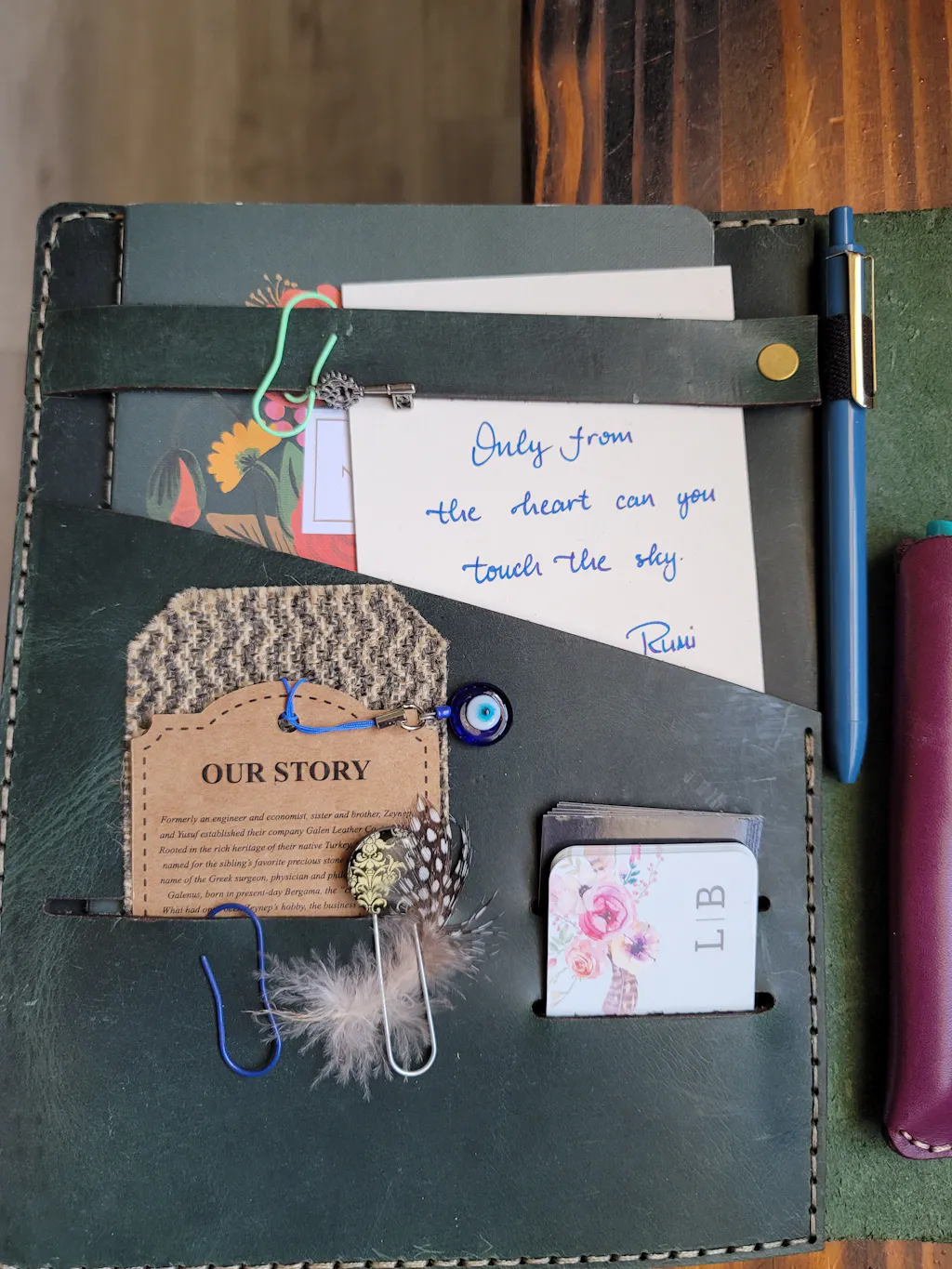 Save yourself the hassle of digging around your bag by keeping your valuables safe and secure in one place. Our Handmade Leather Composition Notebook and iPad Air/Pro (9.7) Cover is the perfect way to store your everyday essentials for work, study or personal use. It has 3 main pockets; one phone pocket and two card holders. On the left side you can put your Field Notes notebook, passport or mobile phone. Under the pockets on both sides there are sleeves for storing your iPad device. An elastic band holds the notebook in place inside on the right side and wraps around the left side of the cover to keep the case securely closed. To keep your portfolio looking its best, you can follow our tips on how to condition leather.