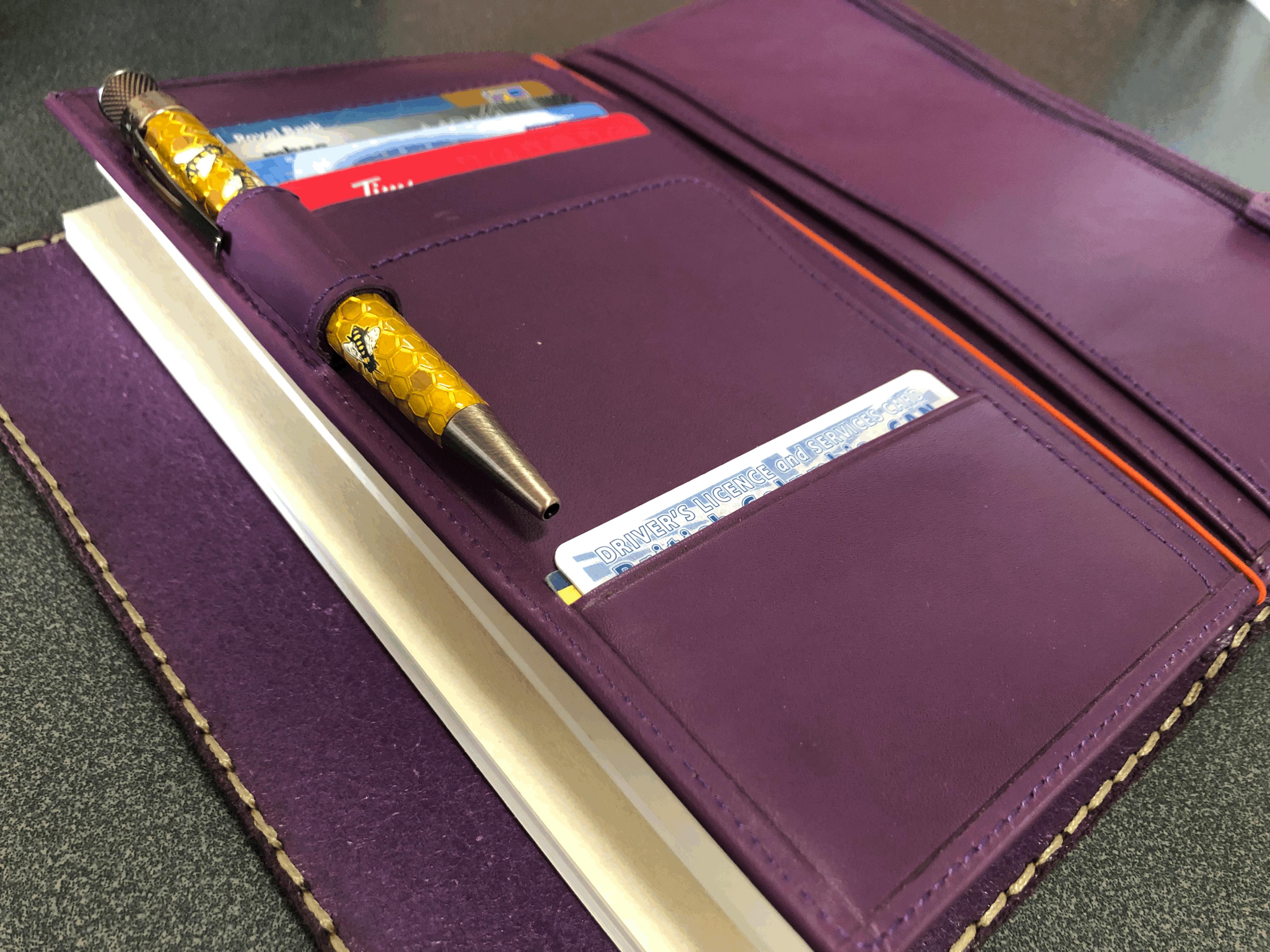 There's also a special pen loop made from 60% leather and 40% hidden elastic which fits any pen or pencil whether it's a Caran Dache 849 or a Pelikan 1000 fp.