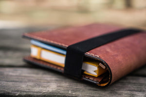 It has 3 main pockets; one phone pocket and two card holders. On the left side you can put your Field Notes notebook, passport or mobile phone. Under the pockets on both sides there are sleeves for storing your iPad device. An elastic band holds the notebook or journal in place inside on the right side and wraps around the left side of the leather notebook holder to keep the case securely closed.