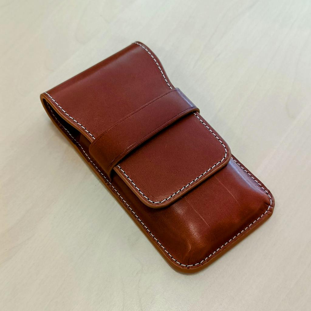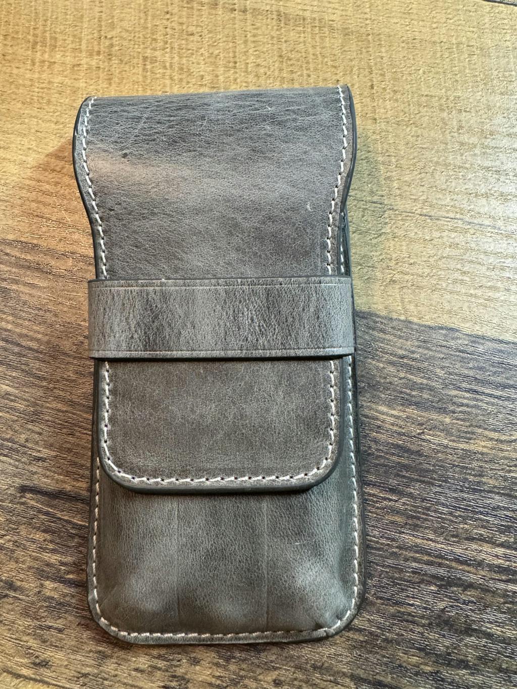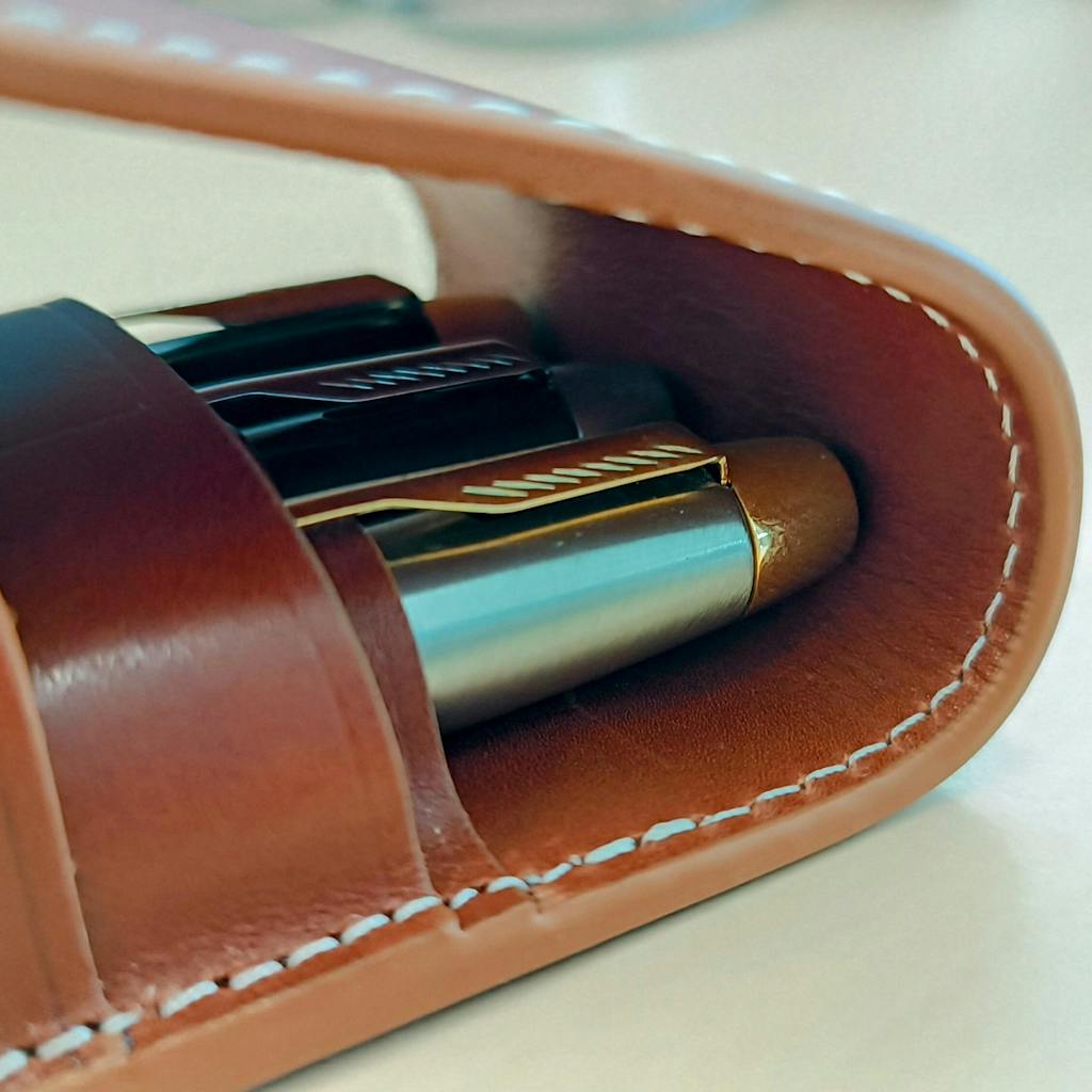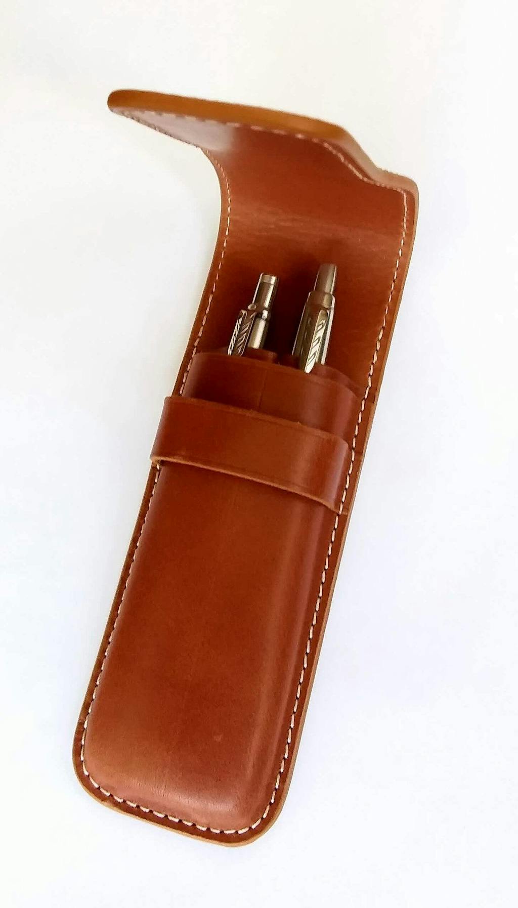 Our Two Pen Leather Flap Pen Case will keep your precious pens from getting scratched, ruined, or from leaking in your bag or jacket pocket. Suitable for most Fountain pens and other type of pens.