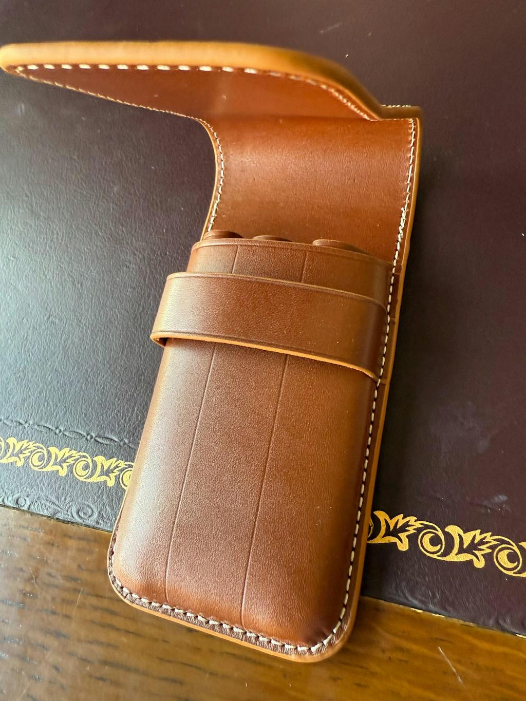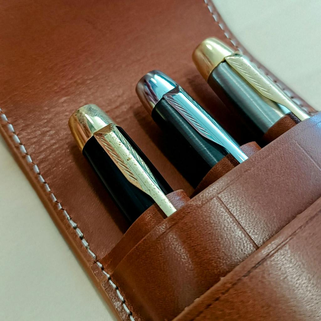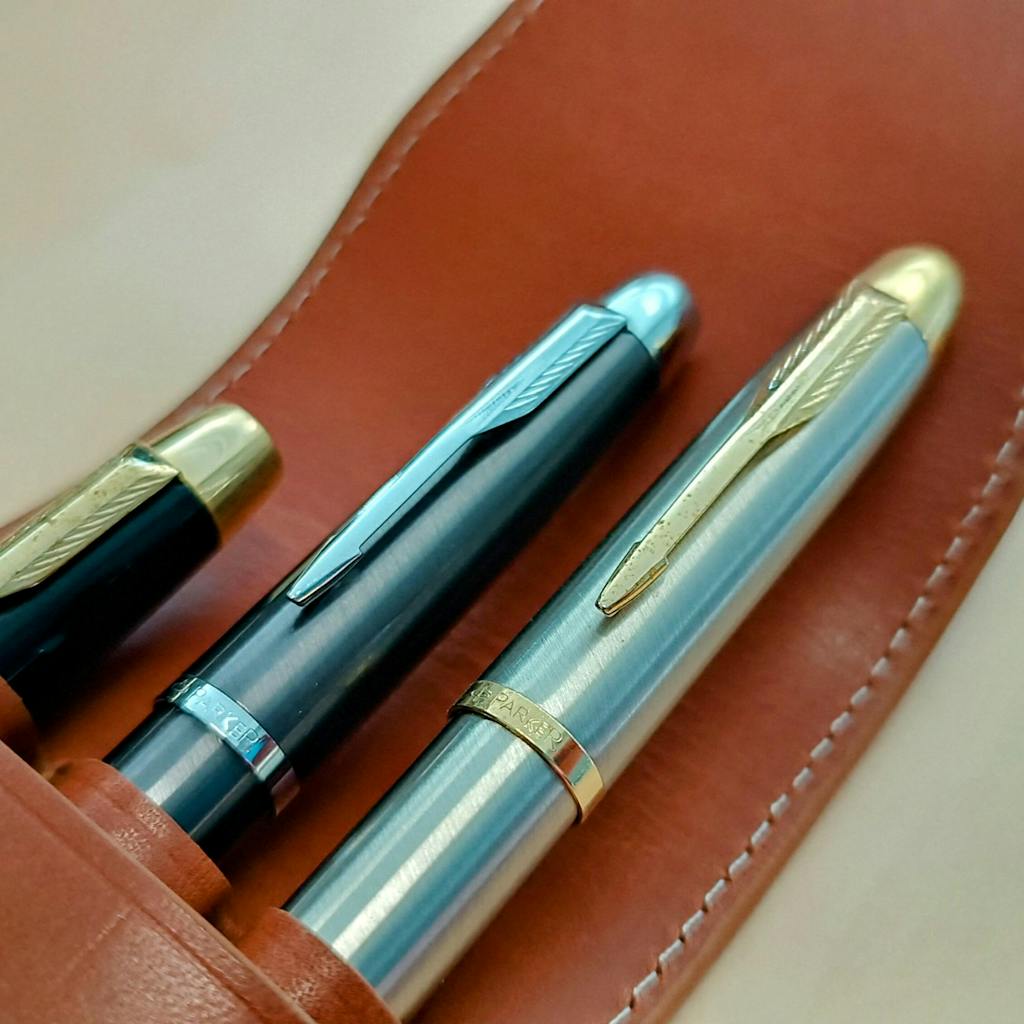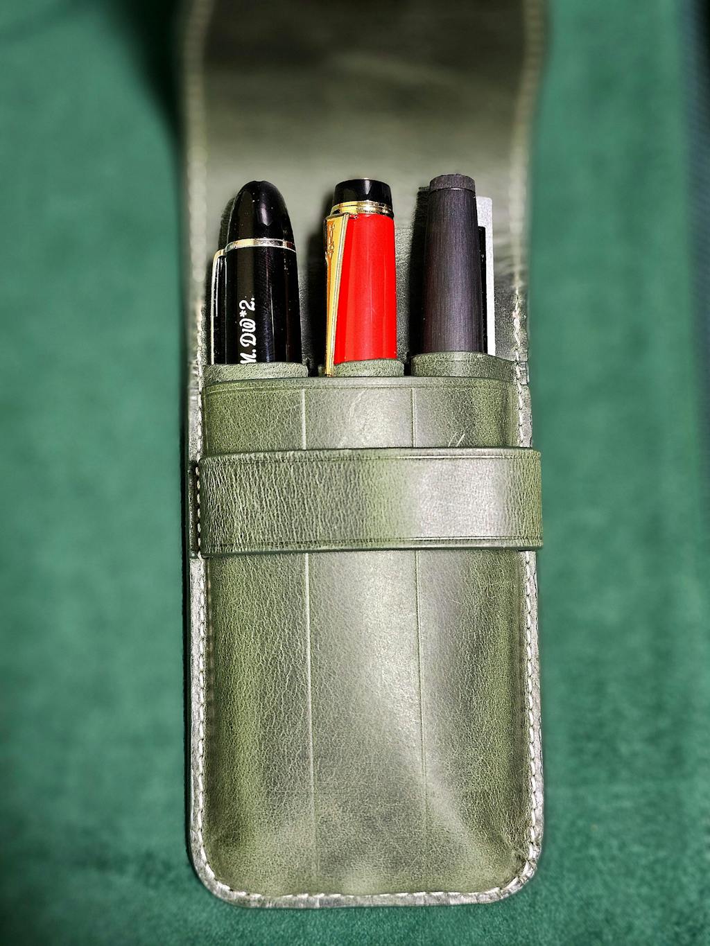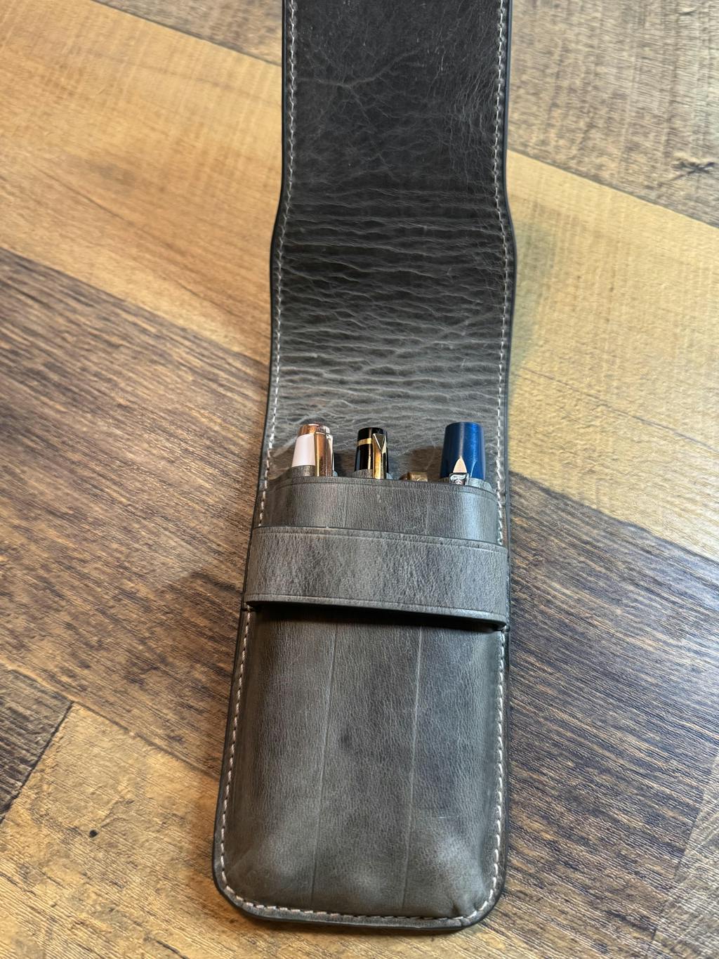 Our Two Pen Leather Flap Pen Case will keep your precious pens from getting scratched, ruined, or from leaking in your bag or jacket pocket. Suitable for most Fountain pens and other type of pens.