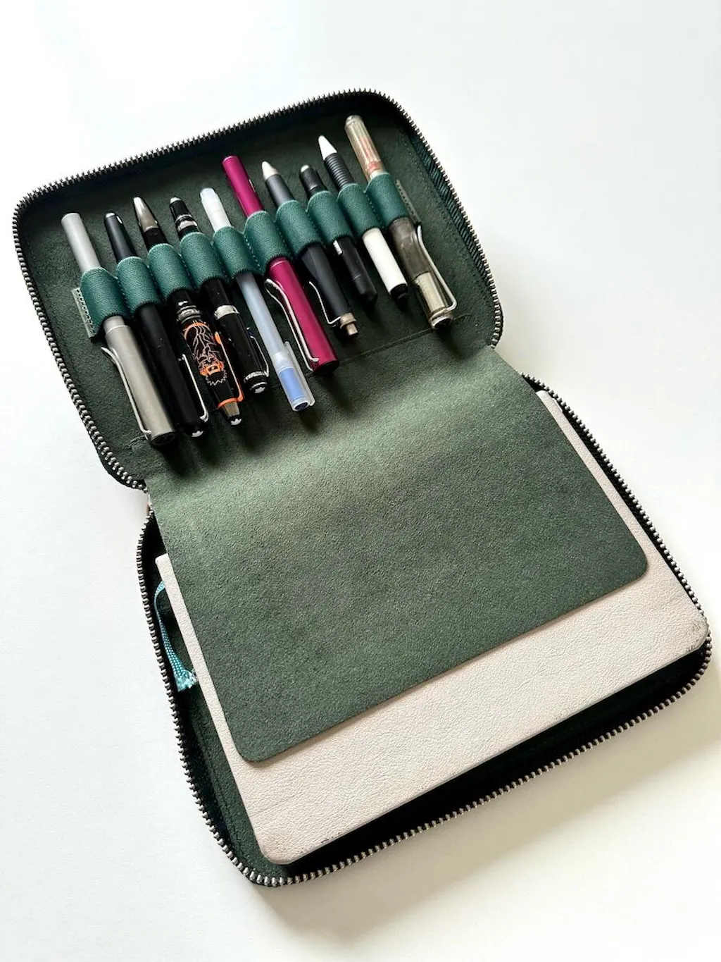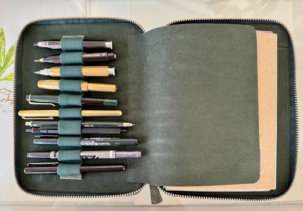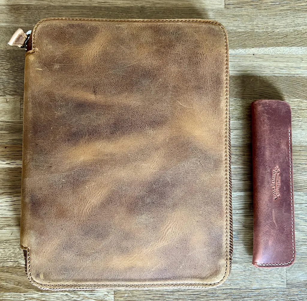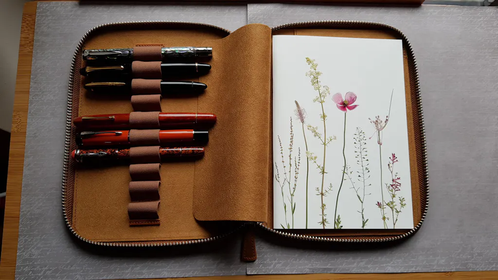 This Leather Zippered Pen Case with an A5 Notebook Holder has a velvet-lined interior and holds up to 10 pens and an A5-sized notebook. When you want to carry your favorite pens, you want them protected in your bag, purse, or pocket to avoid ink leaking everywhere or getting them scratched. This leather pen holder is great to protect your fountain pens and keep them safe. As lovers of stationery, our leather pen cases are one of our flagship product lines.
