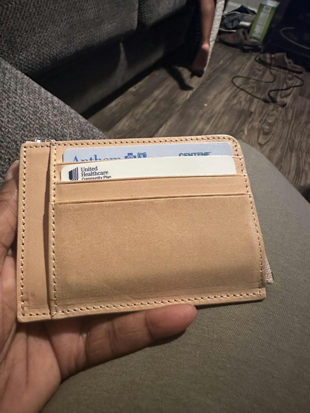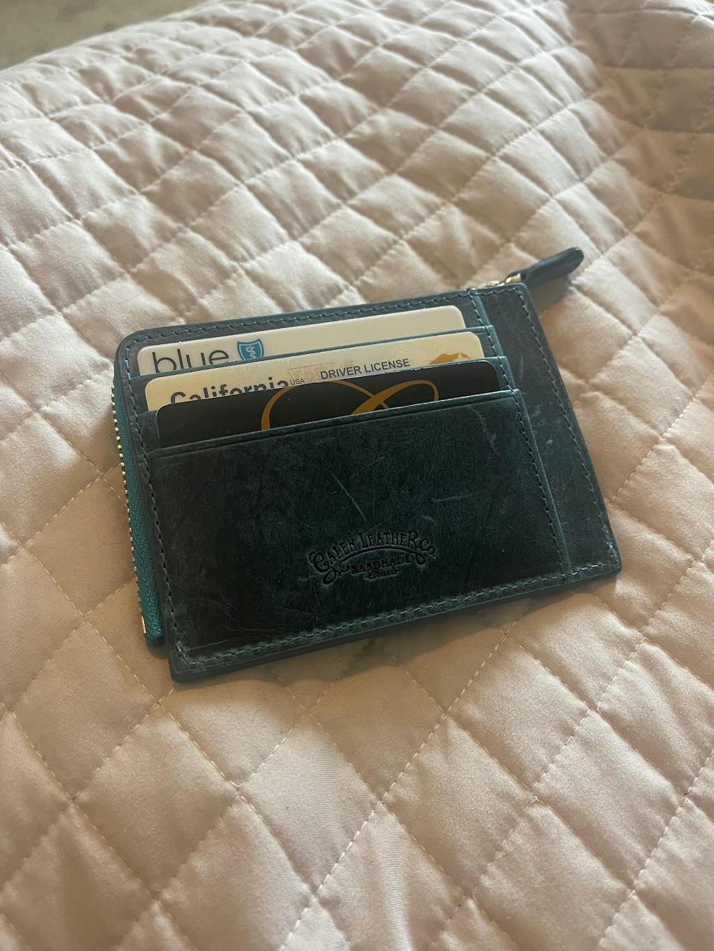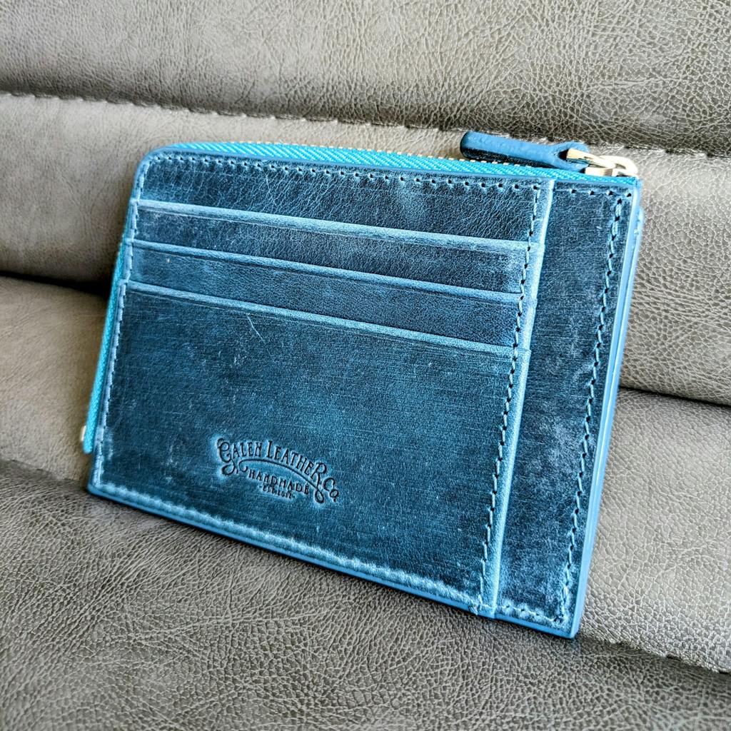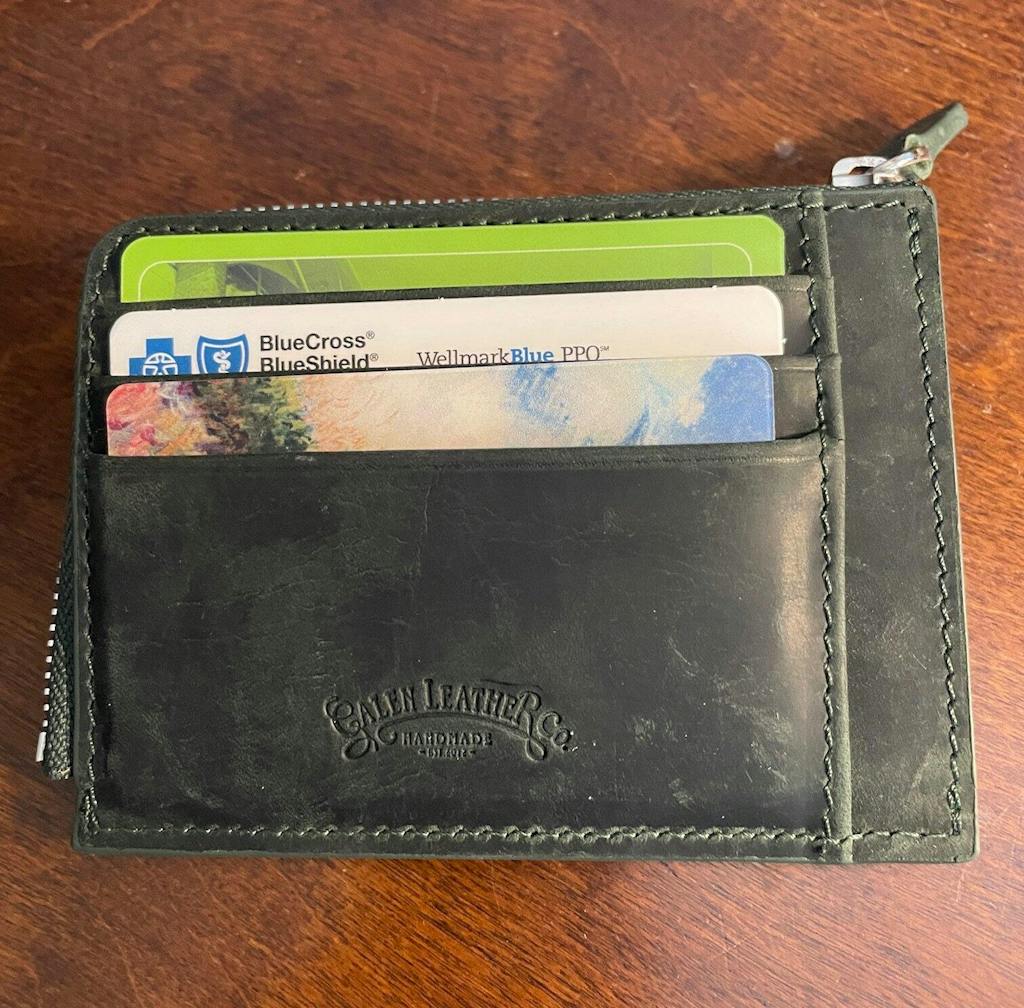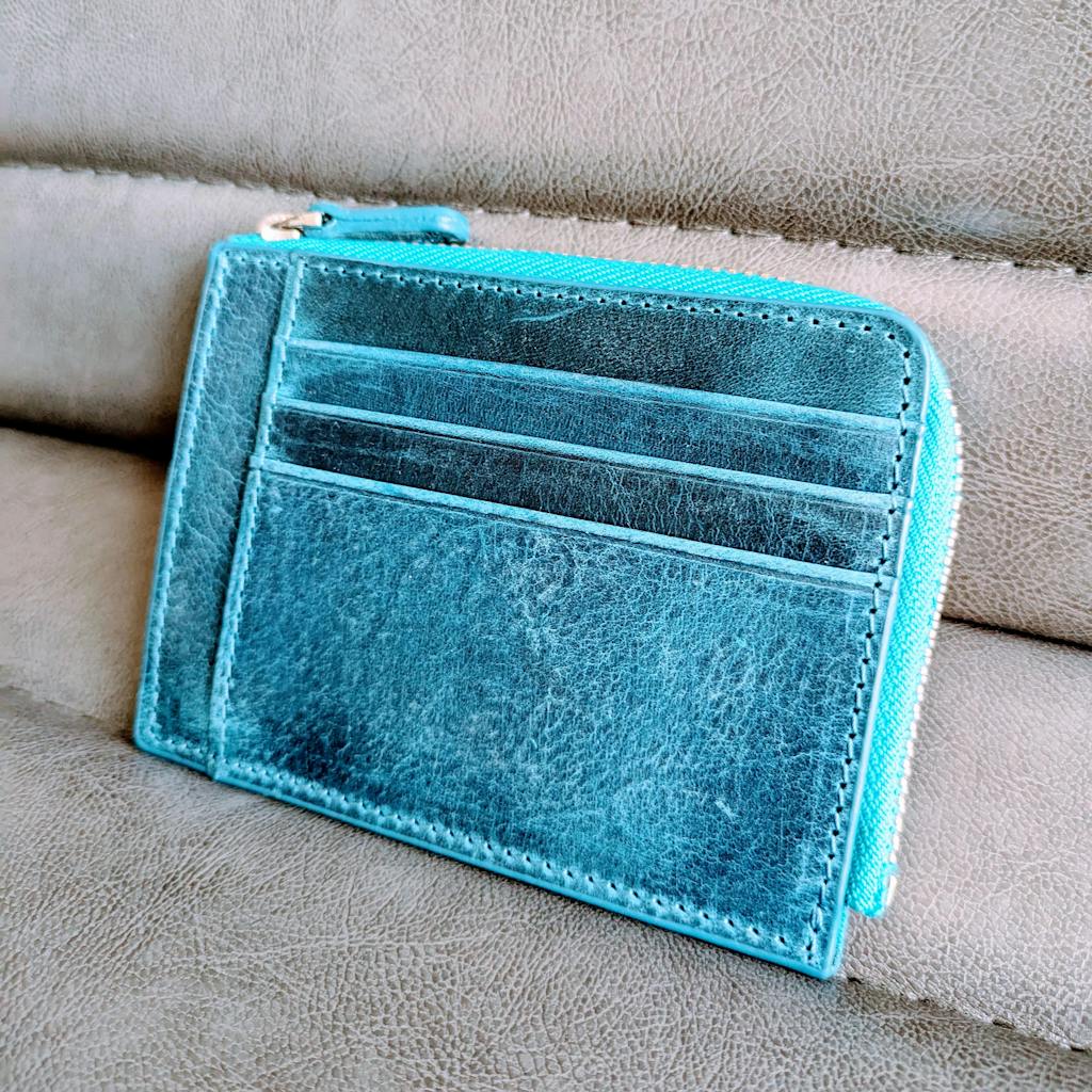 This black mega mini handmade leather wallet is designed to store credit cards, cash and coins. There are 8 card slots, a zippered pocket for cash or receipt and a pouch for coins inside the zippered pocket. Made from full grain leather, it's stylish, professional and will last many years.
