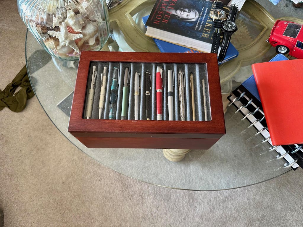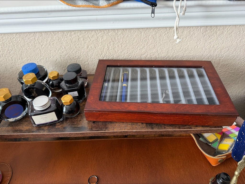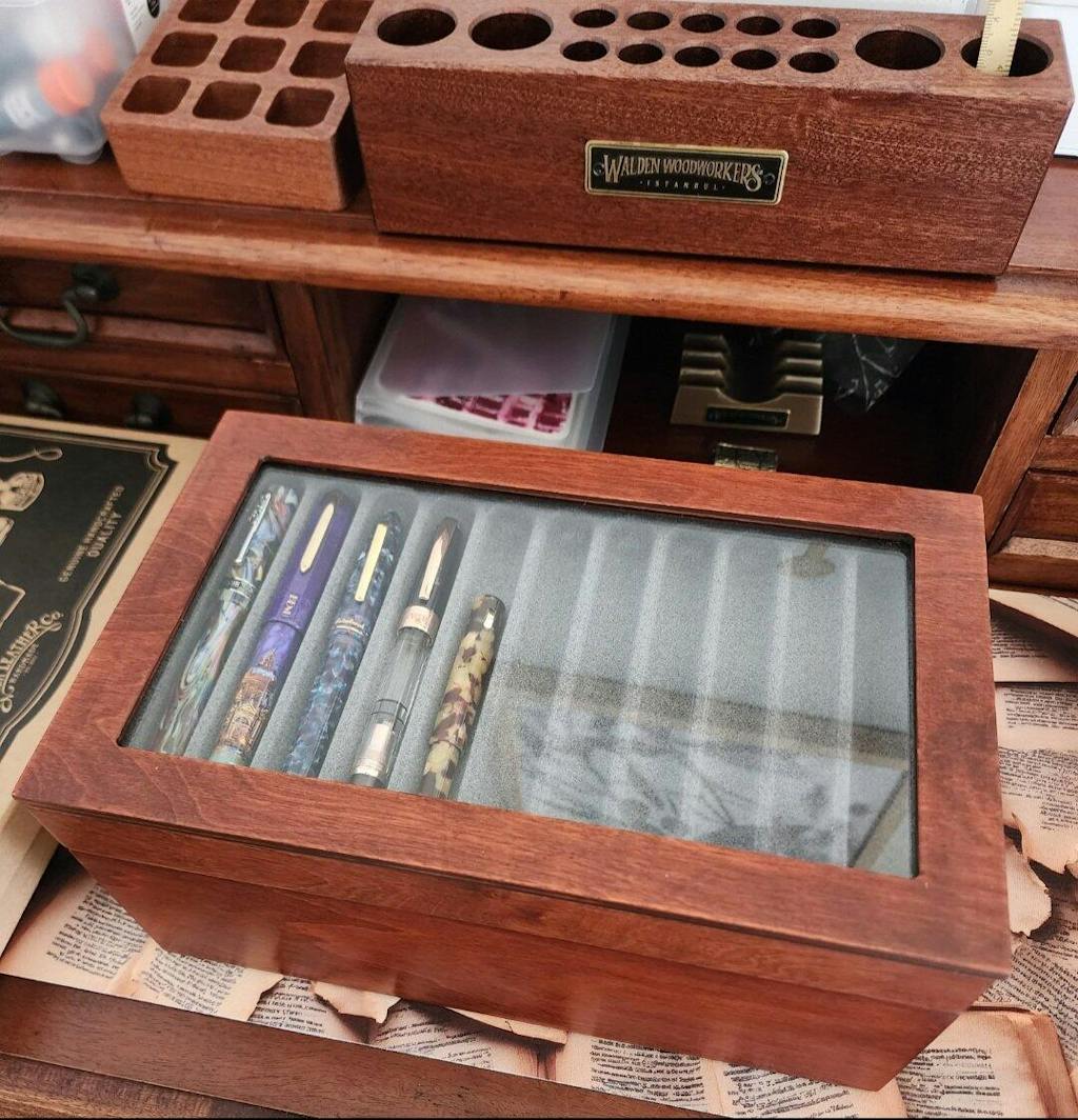 This stunning, handcrafted wooden ink storage container was designed as a safer way to store your inks for ypur precious pen collection.