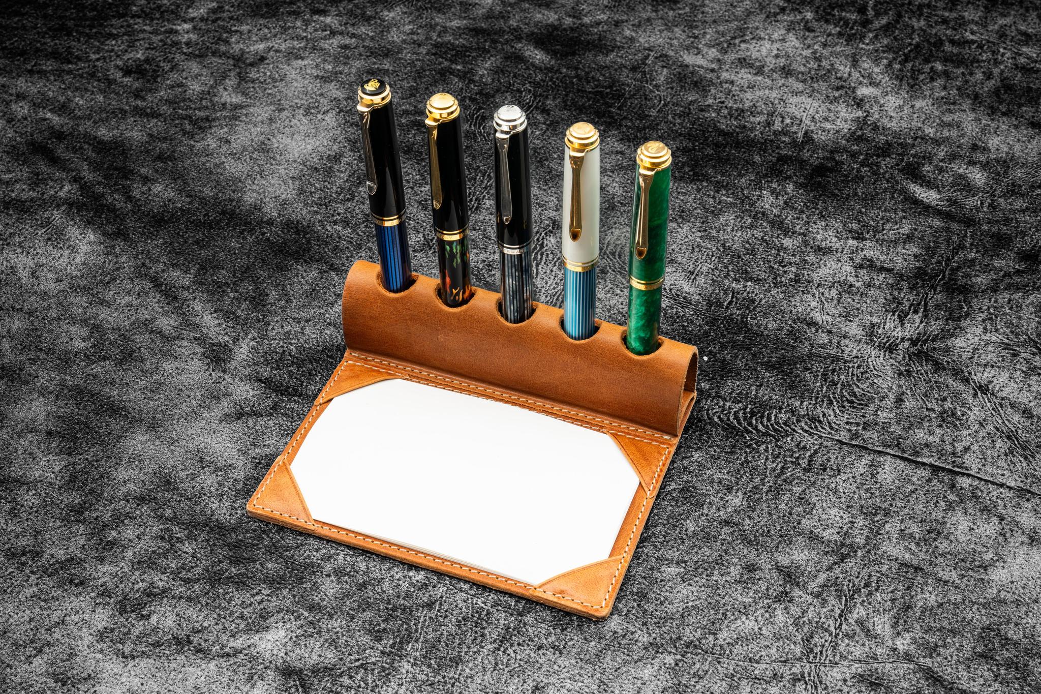 The Writer’s Pen Dock - 5 Slots Pen Stand with Notepad Holder - Crazy Horse Tan