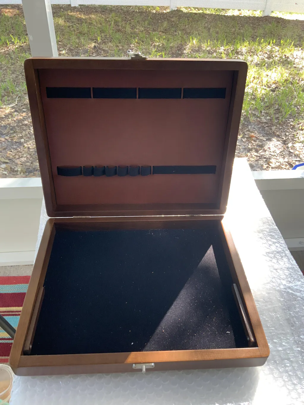 The outer dimensions of the writing box are 12.5” x 10.2” x 2.7”. Finished with natural linseed and tung oil, it’s protected in shipping by a thick cardboard box.