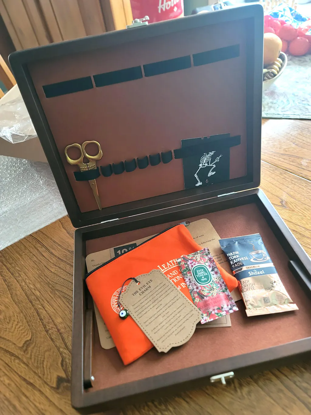 - Crafted from solid walnut wood and vegetable-tanned leather.