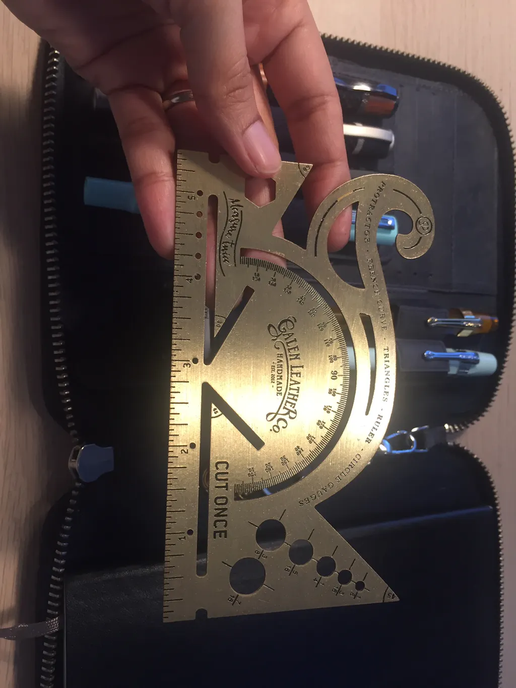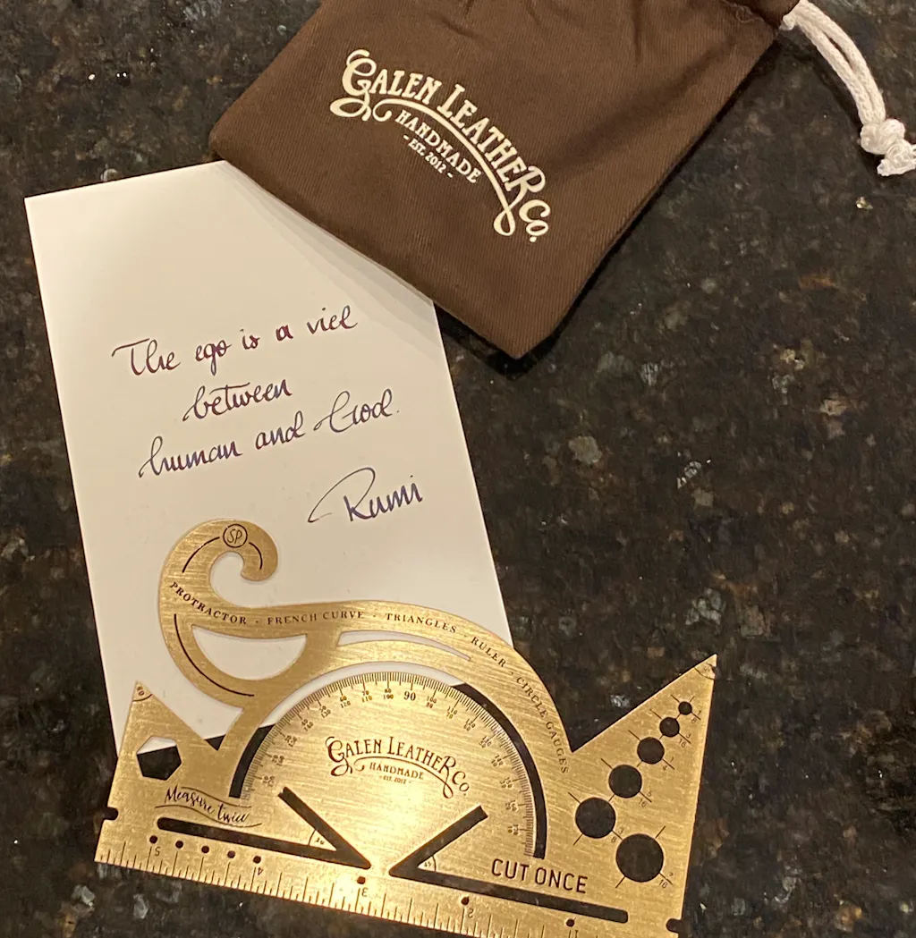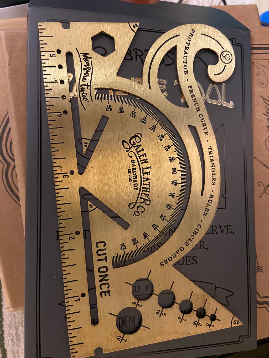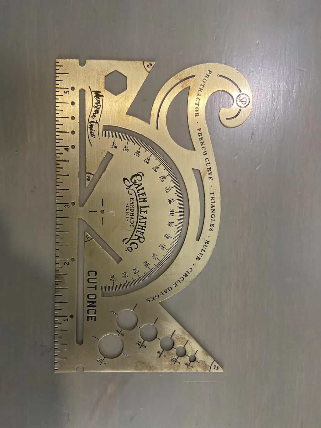 This is the perfect antique-inspired accessory for your desk or to carry with your journal. Made of 100% solid brass and etched for durability with both imperial scales. The combined tool includes a protractor, french curve, triangles and circle gauge. It makes the perfect reference point for all applications.