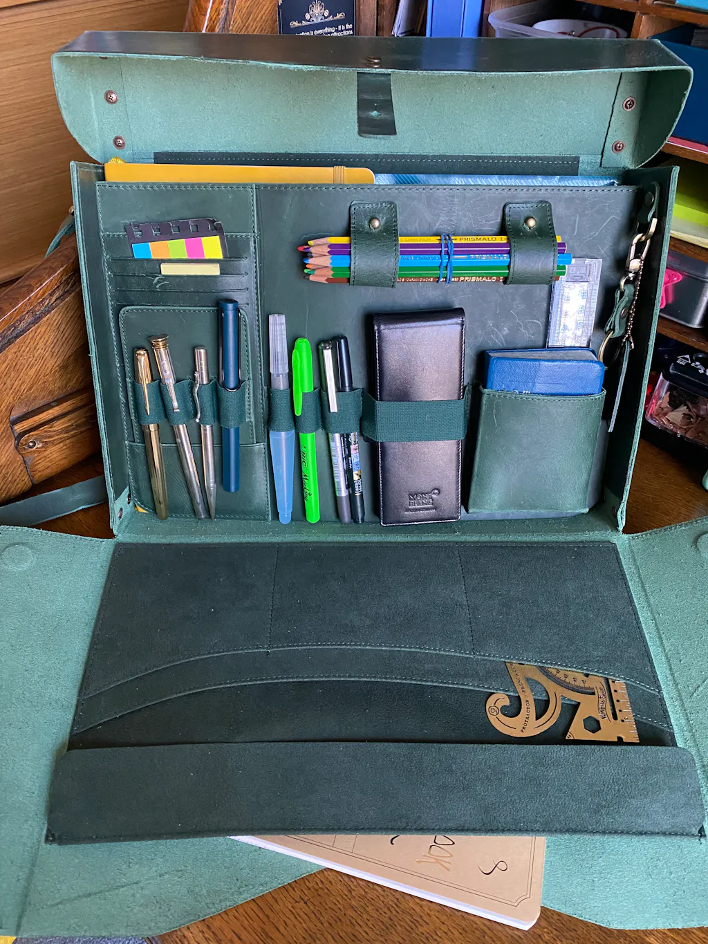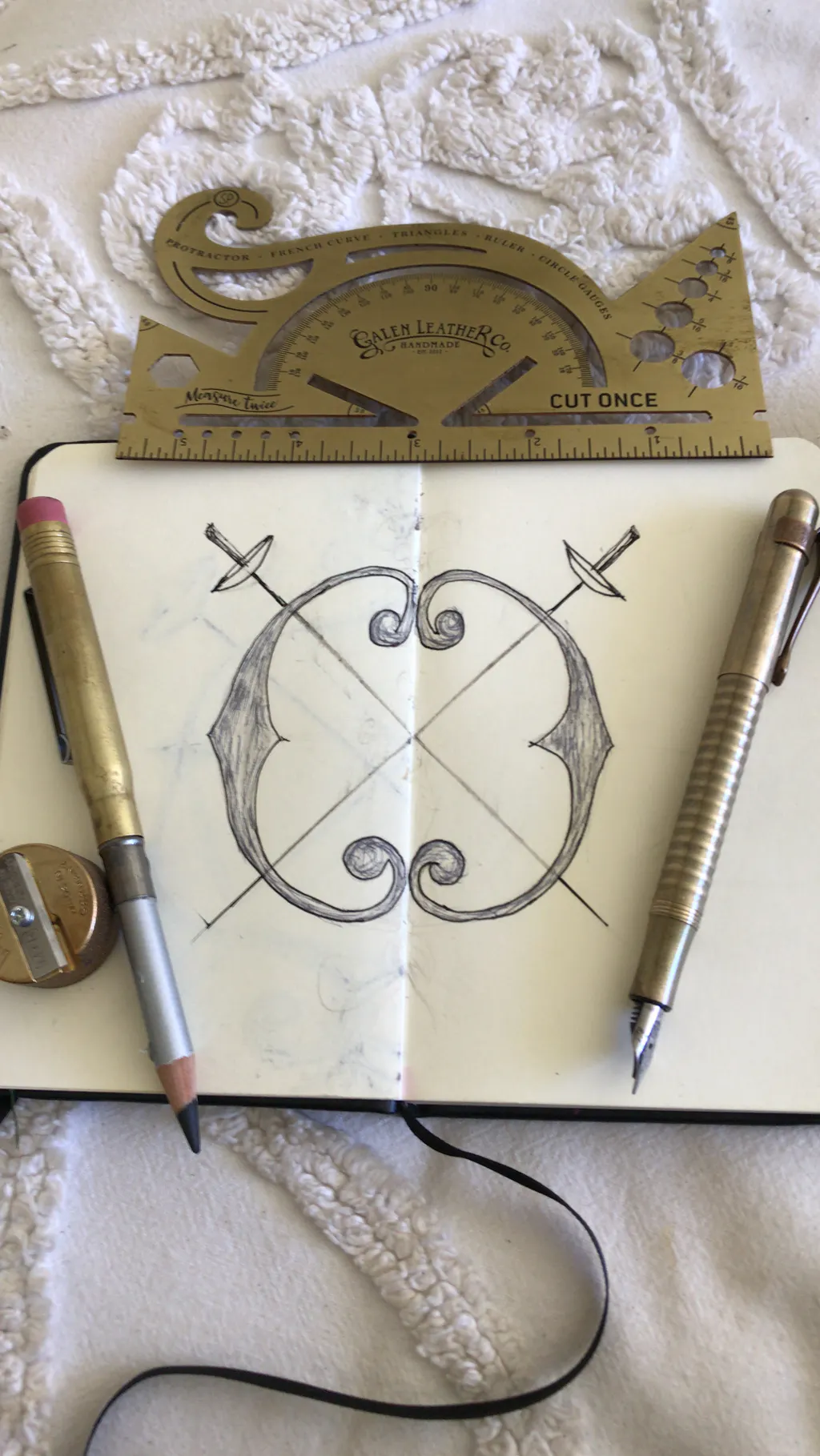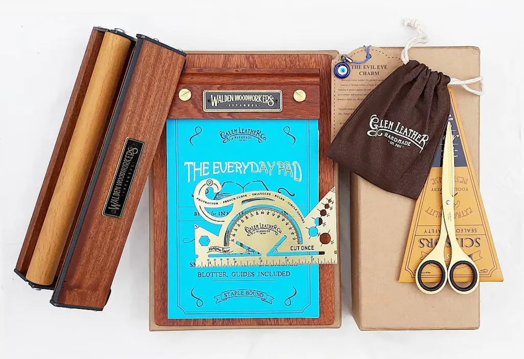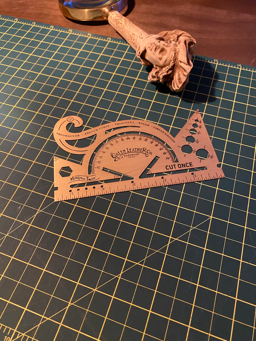 This is the perfect antique-inspired accessory for your desk or to carry with your journal. Made of 100% solid brass and etched for durability with both imperial scales. The combined tool includes a protractor, french curve, triangles and circle gauge. It makes the perfect reference point for all applications.